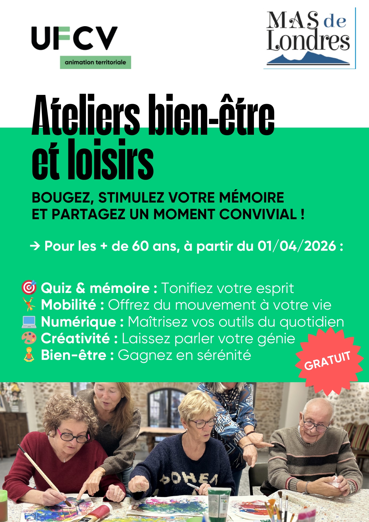 Ainsi, pour « bien vieillir » et rester dans un processus dynamique, de découverte et d’apprentissage, mais aussi pour continuer à prendre du temps pour soi, la commune du Mas de Londes et l’Ufcv va mettre en place des ateliers gratuits à partir d’Avril 2026 les Mercredis après-midi de 14h à 16h.